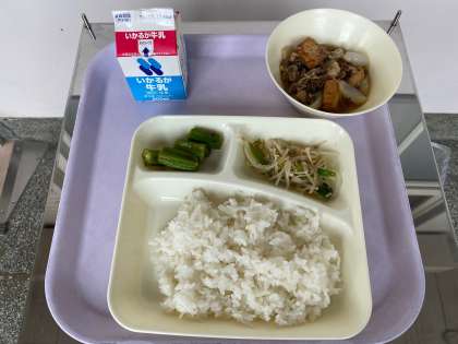 今日のメニューは、すき焼き煮、オクラのかつお梅風味、もやしとピーマンのごまいため、ごはん、牛乳でした。