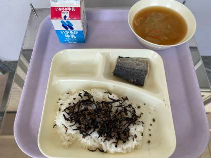今日のメニューは、さごしの塩焼き、みそ汁、牛ひじきそぼろ、ごはん、牛乳でした。