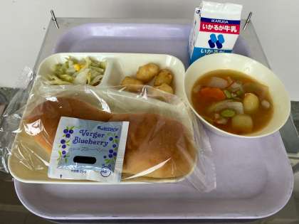 今日のメニューは、いかてんぷら、フレッシュトマトのスープ煮、サワーソテー、パン、牛乳、ブルーベリージャムでした。