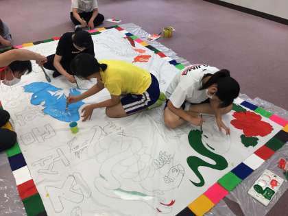 国際クラブ(朝文研)が行われ、文化祭へ向けて旗の作成をしています。