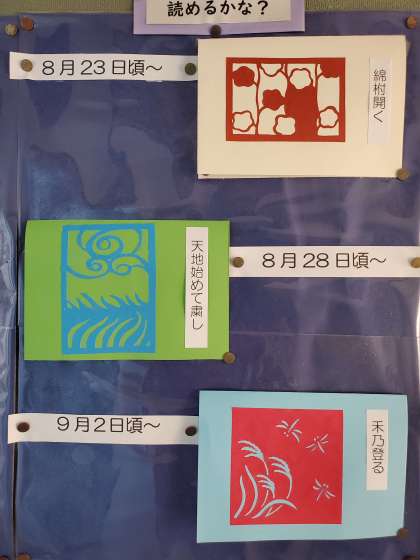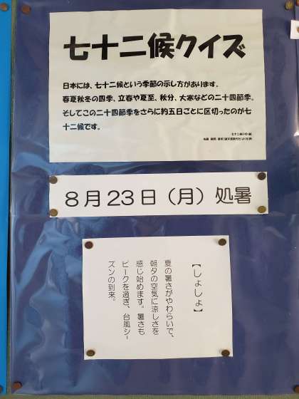 二十四節季では・・・処暑 暑さがおさまるという意味だそうですが、今年はいかがでしょうか。夏休みもそろそろ終わり。夏休みの宿題はバッチリ完成していますか。