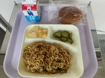 今日のメニューは、オイスターソース焼きそば、きゅうりの中華あえ、和なし(カット缶)、バン(1/2)、牛乳でした。
