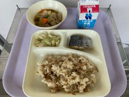 今日のメニューは、さごしの塩焼き、豚肉とじゃがいもの煮もの、キャベツの梅風味、かやくご飯、牛乳でした。