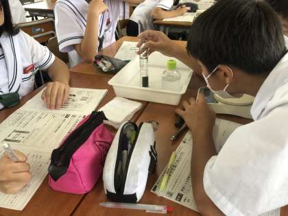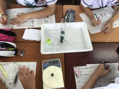 1年生の理科では、密度の違いを利用して、金属の種類を見分ける実験をしました。
