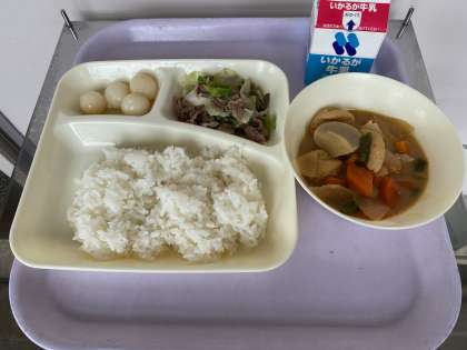 今日のメニューは、一口がんもとさといものみそ煮、牛肉と野菜のいためもの、みたらしだんご、ごはん、牛乳でした。