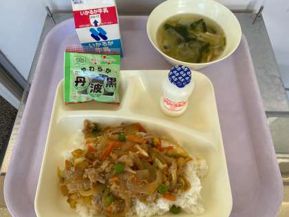 今日のメニューは、ピリ辛丼、中華スープ、ソフト黒豆、発酵乳、ごはん、牛乳でした。