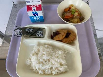 今日のメニューは、みそカツ、じゃがいもと野菜の煮もの、焼きのり、ごはん、牛乳でした。