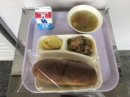 今日のメニューは、豚肉と野菜のケチャップソテー、スープ、スイートポテト、パン、牛乳でした。