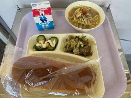 今日のメニューは、牛肉のカレー風味焼き、ほたて貝とトマトのスープスパゲッティ、きゅうりとコーンのサラダ[ノンエッグドレッシング]、パン、牛乳でした。
