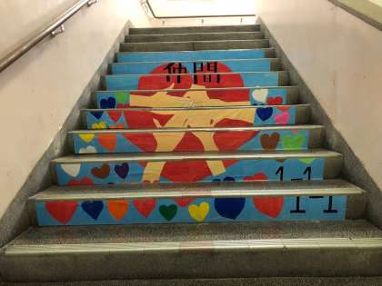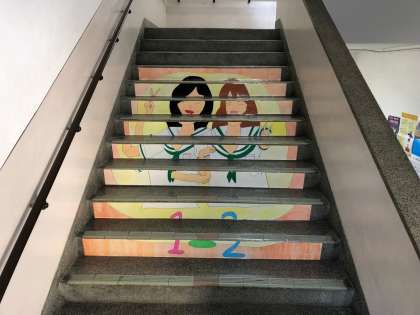1年生は、階段アートを作成し、職業調べを展示しました。