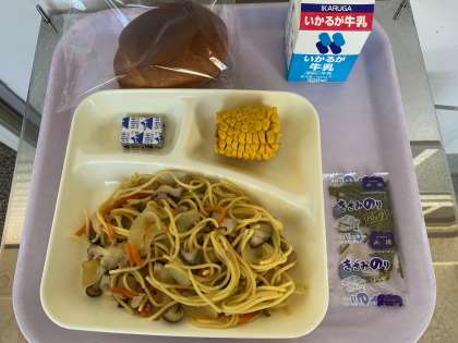 今日のメニューは、ウインナーときのこの和風スパゲッティ、焼きとうもろこし、固形チーズ、パン(1/2)、牛乳でした。