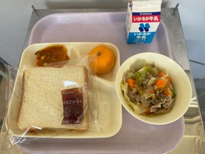 今日のメニューは、豚肉と野菜のスープ煮 変わりピザ、みかん、パン、牛乳、いちごジャムでした。