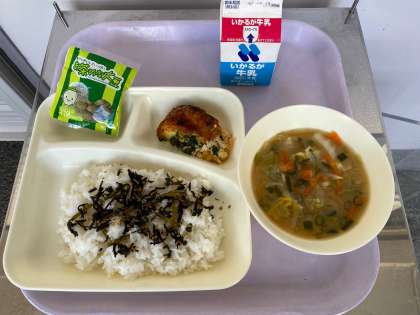 今日のメニューは、千草焼き、みそ汁、ごまひじき、まっ茶大豆、ごはん、牛乳でした。