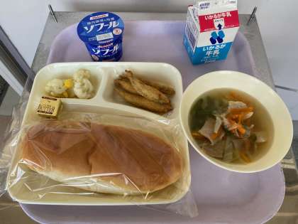 今日のメニューは、わかさぎフライ、スープ、カリフラワーとコーンのサラダ、ヨーグルト、パン、牛乳でした。