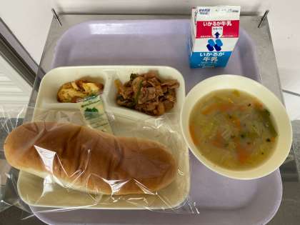 今日のメニューは、豚肉のケチャップソテー、コーンスープ、焼きプリン、パン、牛乳でした。