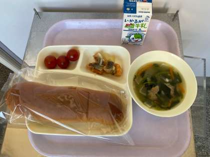 今日のメニューは、さけのマリネ、肉だんごと麦のスープ、プチトマト、パン、牛乳でした。