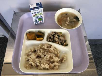 今日のメニューは、豚肉と干しずいきのみそ煮、うすくず汁、焼きかぼちゃの甘みつかけ、かやくご飯、牛乳でした。
