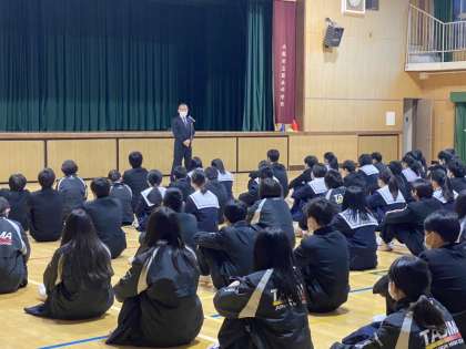 始業式で、校長先生からは、オミクロン株の感染の拡大が広まっている中、感染対策には充分にとりくんでいこうとの話がありました。また、お笑い芸人やイチロー選手のエピソードを通して、小さいことをやり切ること、継続することの大切さについて話がありました。