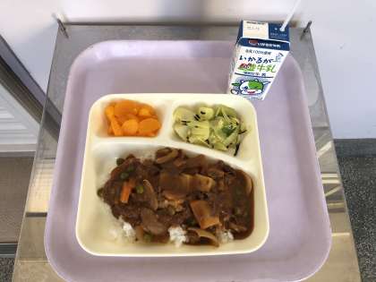 今日のメニューは、ハヤシライス、キャベツのひじきドレッシング、みかん(缶)、牛乳でした。