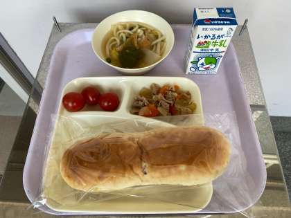今日のメニューは、豚肉と野菜の煮もの、なにわうどん、プチトマト、パン、牛乳でした。