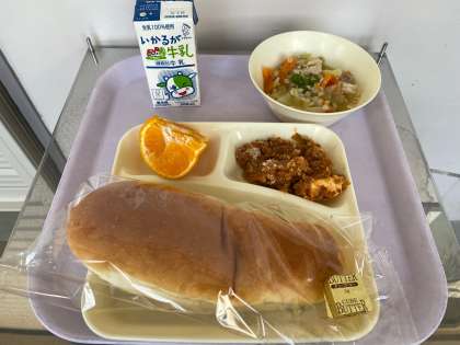 今日のメニューは、とうふのミートグラタン、押麦と野菜のスープ煮、デコポン、パン、牛乳でした。