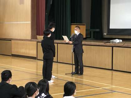 図書室の本を多く借りた人に贈られる「多読賞」の表彰があり、その後、代表生徒に終了証が授与されました。また、生徒会役員選挙の結果が報告され、新しい生徒会役員の発表がありました。