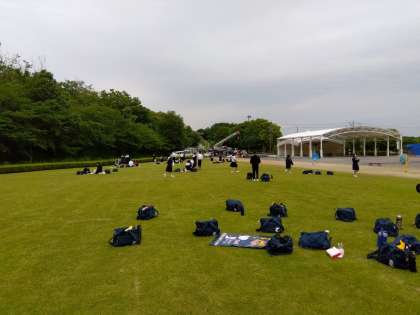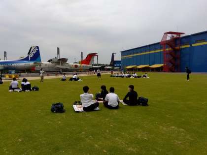 芝生広場での昼食後、無邪気に遊ぶ田島中学校生。
