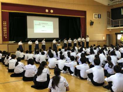 生徒集会では、安全保健委員会の発表が行われました。各学級の就寝時間や起床時間などの結果から、携帯電話の利用の仕方をはじめ、よりよい学校生活を送るために大切な生活習慣について教えてくれました。