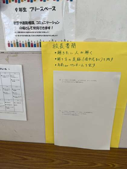 9年生の廊下のフリースペースの壁に校長からの書簡が貼られました。