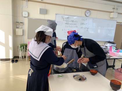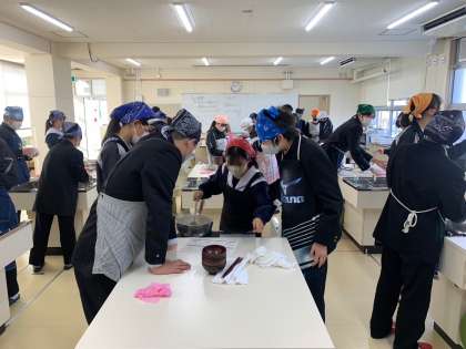 12月1日(木)と8日(木)に8年生で調理実習が行われました。作ったのは「豚汁」。出来上がりをみなさんおいしくいただいていました。