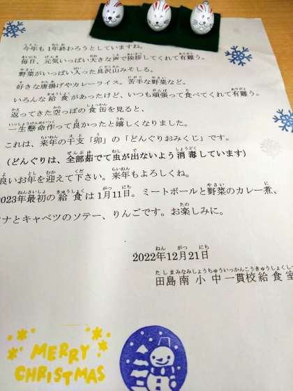 先日、給食調理室のみなさんから田島南小中一貫校の生徒のみなさんにプレゼントがありました。ひとつひとつ心のこもった手作りのどんぐりおみくじひいて、みんなで楽しく給食をいただきました。ありがとうございました。ごちそうさまでした。来年も愛情たっぷりの美味しい給食を楽しみにしています💛