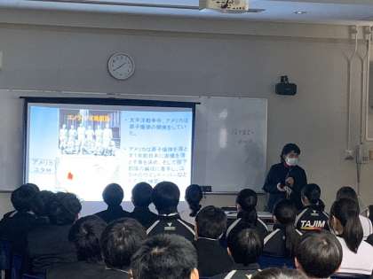 1月27日(金)の午後から多目的室にて8年生全員で平和学習を実施しました。今回は広島県より被爆体験伝承者「山岡美知子」さんをお招きして講話していただきました。生徒の皆さんは山岡さんの話に集中し、とても途中から入りずらくなるぐらいの雰囲気で行われいました。今後は山岡さんの話を9年生で実施される修学旅行の取り組みなどに活かしてもらいたいと思います。