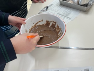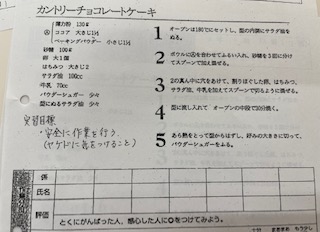 9年生の家庭科の授業では調理実習で「チョコレートケーキ」を作りました。みんなで協力して実習目標を達成していました。