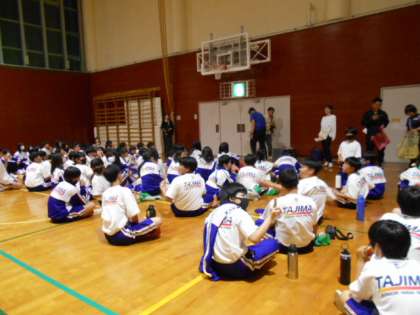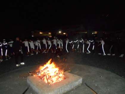 火の神から授けられた炎のまわりで、じゃんけん列車で大盛り上がり。最後は、校歌とオワリはじまりを肩を組んで大合唱。終了後、クリームパンとオレンジジュースの夜食をいただいて就寝。明日も元気にがんばります。