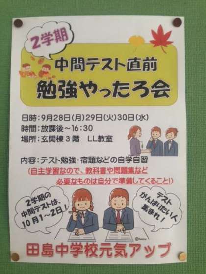 昨日までの「勉強やったろ会」では、意欲的に学習する生徒が増えてきたと聞いています。