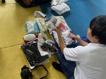なかには自分の前にきれいに荷物を並べている生徒もおり、ひとり一人の性格も見えてとても面白い事前指導でした。週末は体調を整えて、月曜日は元気に集合してくださいね。