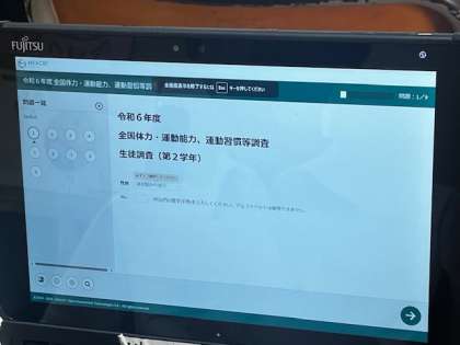 8年生はタブレットを使って全国体力・運動能力、運動習慣等調査のアンケートに答えています。