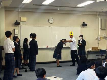 9年生は3週間の教育実習生への感謝の気持ちを込めて、クイズ大会を行いました。実習生にまつわる問題を出して、各班で正解を競い合い、同点の班は実習生とじゃんけんをして優勝を決定しました。