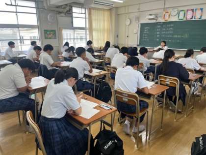 9年生の皆さんは、自身の評定にも関わるテストということで、とても真剣にテストに臨みました。よく頑張りましたね!2学期はこのあとも実力テストが定期的に実施されます。進路の実現に向けて、これまでの学習を振り返り、しっかりと復習しましょう。