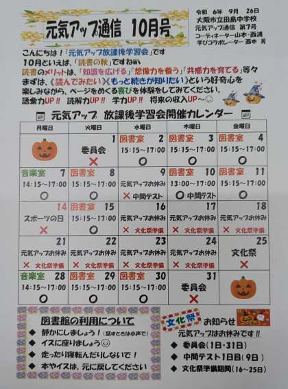 10月の予定表です。やっと朝晩が涼しいくなってきましたね。寒暖差で体調を崩さないよう気をつけて、みんなと一緒に楽しく学習しましょう!!