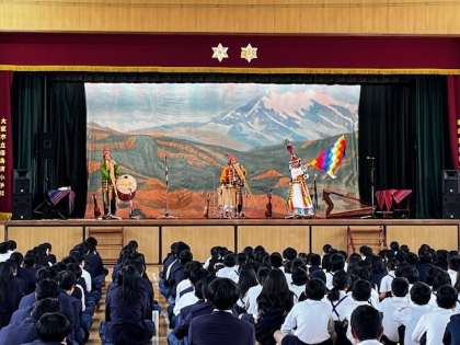 色彩鮮やかな民族衣装に身を包み、アンデス・ボリビアの文化を感じることのできる演奏をしていただきました。また、「もののけ姫」など日本の曲も演奏しながらボリビア、パラグアイの代表的な楽器を紹介していただきました。