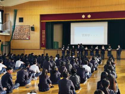 そして全校集会では、副校長先生から「笑顔であいさつを続けよう」、「Teamsとスクールライフノートのアンケートに答えよう」、「車いすダンス講演を楽しもう」というお話がありました。学校に来校する方々が生徒の皆さんのあいさつに喜んでくださっています。これからも笑顔ですてきなあいさつを続けてくださいね。