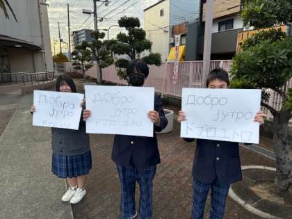 中学生はもちろん小学生も、登校してくる児童生徒の皆さんが「ん?どこの国の言葉なんだろう?」と首をかしげながらも、先週と同じように「ドブロユトロ!」と元気な声であいさつを交わしてくれました。
