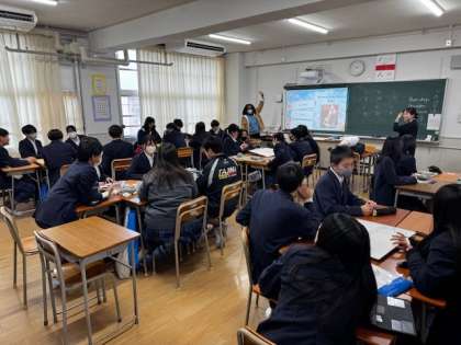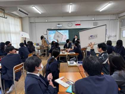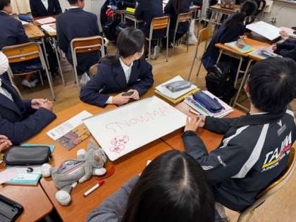 今日の8年生の英語の授業では、C-NETの先生が用意したクリスマスにまつわる質問に班で答え、ポイントを競いました。