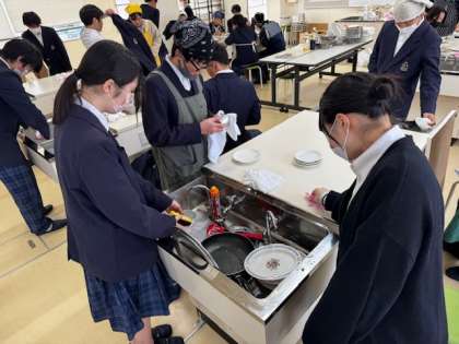 今日の8年生の家庭科の授業は、調理実習で餃子を作りました。餃子を包むのが得意な先生がお手伝いして、事前に包み方の映像を撮ってもらいました。子どもたちはそれを食い入るように見つめたおかげか、どの班も上手に包むことができていました。また「とても美味しいです!」、「ラー油を入れすぎてちょっと辛いです!」など味つけも大変好評で、一緒に食べた先生方もすごく褒めていました。食べて楽しんだ後はみんなで片付けもしっかり取り組むことができ、とても楽しい調理実習となりました。