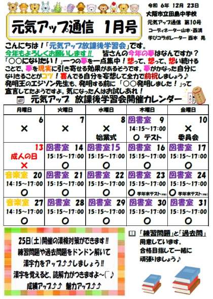 1月の予定表です。1月はお正月のあと、すぐに3学期が始まりますね!インフルエンザなどの感染症が流行しているので、からだを温かくして体調を崩さないよう気をつけて、みんなと一緒に楽しく学習しましょう!!