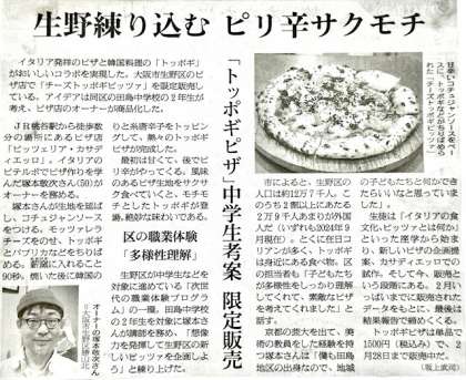 桃谷駅前商店街にある「ピッツェリア カサディエッロ Pizzeria CASATIELLO」さんの新メニュー『チーズトッポギピッツァ』について、1月25日(土)の朝日新聞朝刊で取り上げられました!皆さんぜひご賞味ください!