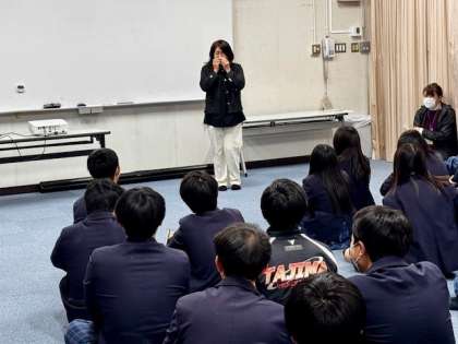 お話のあと、学年の先生方からメッセージカードと合格鉛筆・消しゴムがプレゼントされました。9年生の皆さんがメッセージを眺めているところに、サプライズでなんと!昨年の3月まで学校にいらした外薗先生が登場してくださいました!