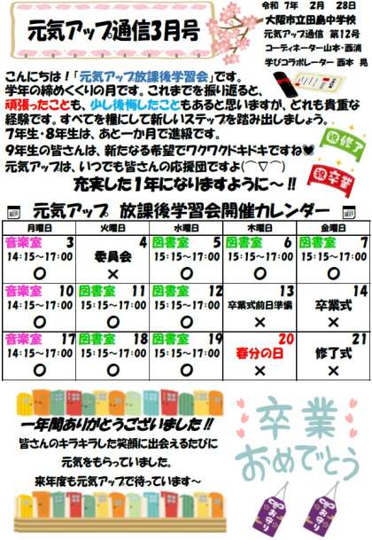 3月の予定表です。あっという間に1年が終わりますね。体調を崩さないよう気をつけて、3学期も最後までみんなと一緒に楽しく学習しましょう!!