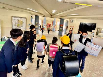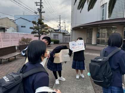 児童会ではあいさつしてくれた人に花びらを渡して、各クラスに掲示してある木を花でいっぱいにするとのことでした。また、中学校の風紀委員の皆さんも参加して「身だしなみを整えよう」と声かけを行うなど、生徒会の元気なあいさつとともに、朝からとても賑やかで楽しい取組となりました。